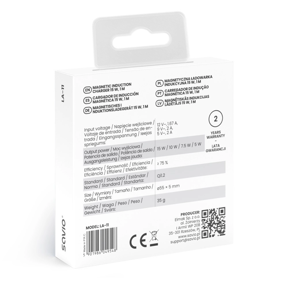 Compatibilité avec Qi et MagSafe : Grâce à l'utilisation de la norme Qi 1.2, le chargeur Savio LA-11 prend facilement en charge la recharge inductive sans fil. Le système magnétique intégré est idéal pour les appareils compatibles MagSafe, garantissant une connexion stable et précise.