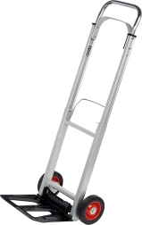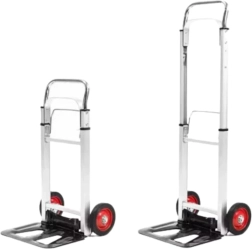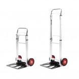Le chariot est équipé d’une poignée télescopique, d’une plateforme pliante et d’un système de verrouillage automatique, ce qui assure une mise en service rapide et un rangement compact. L’ensemble est complété par des roues en caoutchouc robustes sur axes en acier, montées sur roulements, qui n’endommagent pas la surface et garantissent une conduite fluide.