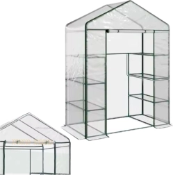 Le modèle comprend 4 étagères latérales et 2 espaces libres au sol, ce qui permet de ranger des pots plus hauts ou de cultiver des plantes grimpantes. La porte zippée facilite l’accès à l’intérieur et la structure avec des raccords en « T » assure un montage rapide et intuitif sans outils.