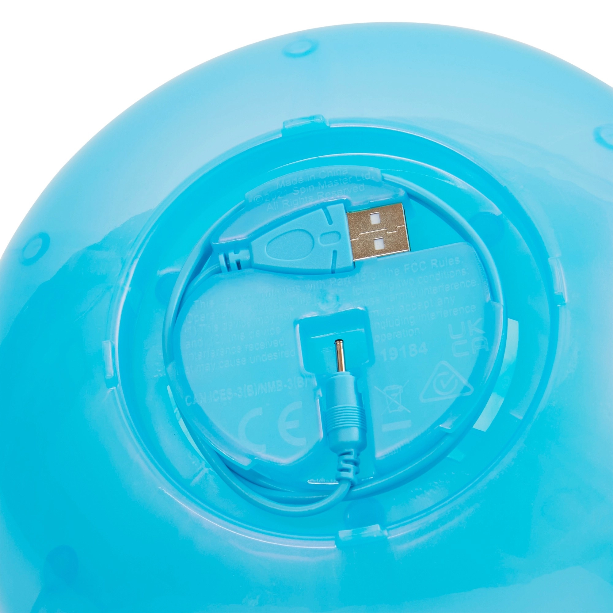 Rechargez facilement le jouet via USB et gardez le câble toujours à portée de main grâce à l’espace de rangement intégré dans la base.
