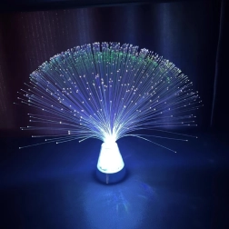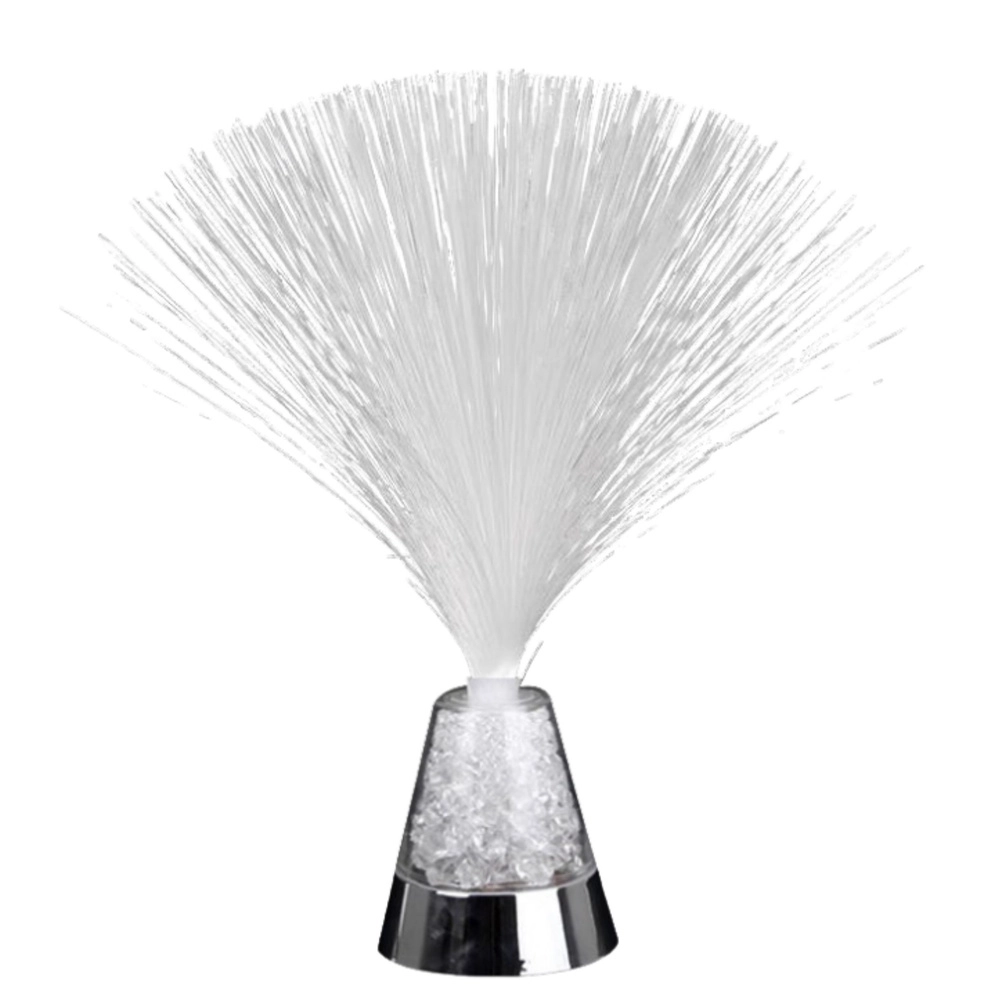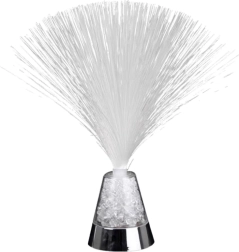 Lumière douce et uniforme crée une atmosphère agréable de détente et de calme. La lampe est montée sur une base stable avec un remplissage transparent imitant des cristaux de glace, complétée par une finition chromée élégante. Les fibres optiques souples s'étendent en forme d'éventail, leurs extrémités scintillent doucement de différentes couleurs.