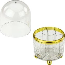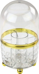 L’organiseur est fabriqué en plastique résistant, à l’aspect verre, et orné d’une élégante finition dorée. À l’intérieur se trouvent des compartiments pratiques pour organiser pinceaux, rouges à lèvres, mascaras ou petits accessoires.
