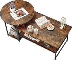 La possibilité d’emboîter la table ronde permet d’adapter rapidement l’espace aux besoins du moment – elle peut être utilisée comme table indépendante ou partie du set. Les deux tables disposent d’étagères supplémentaires pour ranger journaux, livres, télécommandes ou décorations. Cet ensemble s’intègre parfaitement aux aménagements loft, industriels, mais aussi modernes et classiques.