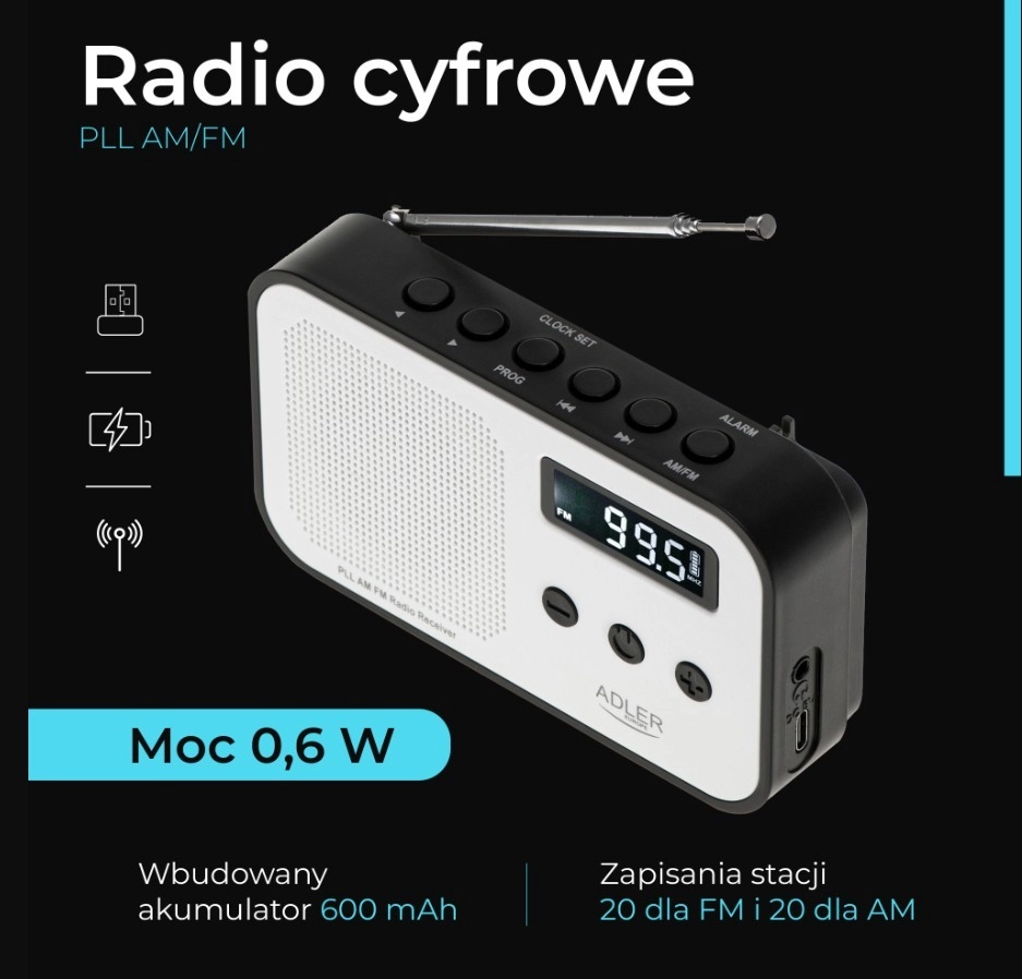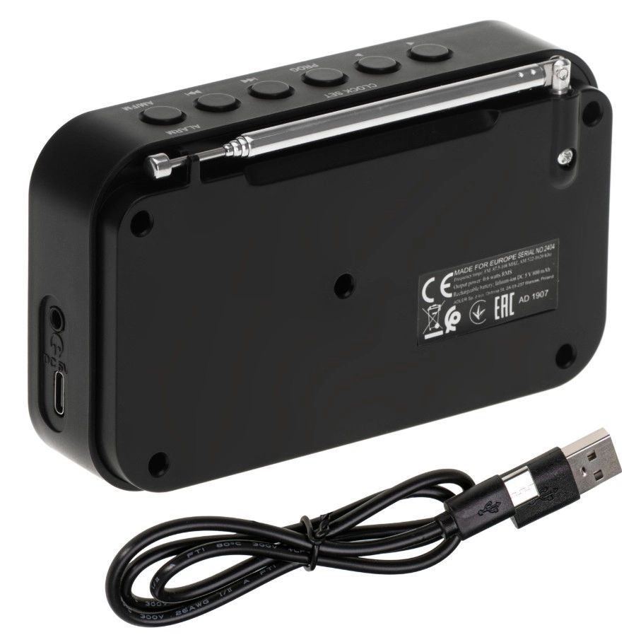 Découvrez les fonctionnalités intégrées, telles que l'horloge, le réveil, le mode veille et l'arrêt retardé. La radio est équipée d'une prise casque de 3,5 mm pour une écoute privée et offre une puissance optimale de 0,6 W pour un son clair et net. Avec une batterie intégrée de 600 mAh, la radio vous offre une longue durée d'écoute sans besoin de recharge. L'alimentation moderne USB-C assure une recharge rapide et pratique.