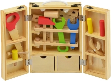 Boîte à outils en bois pour enfants dans une mallette pratique ! Un ensemble idéal pour les petits bricoleurs qui développe la motricité et la créativité.