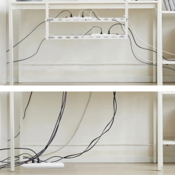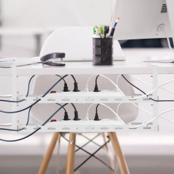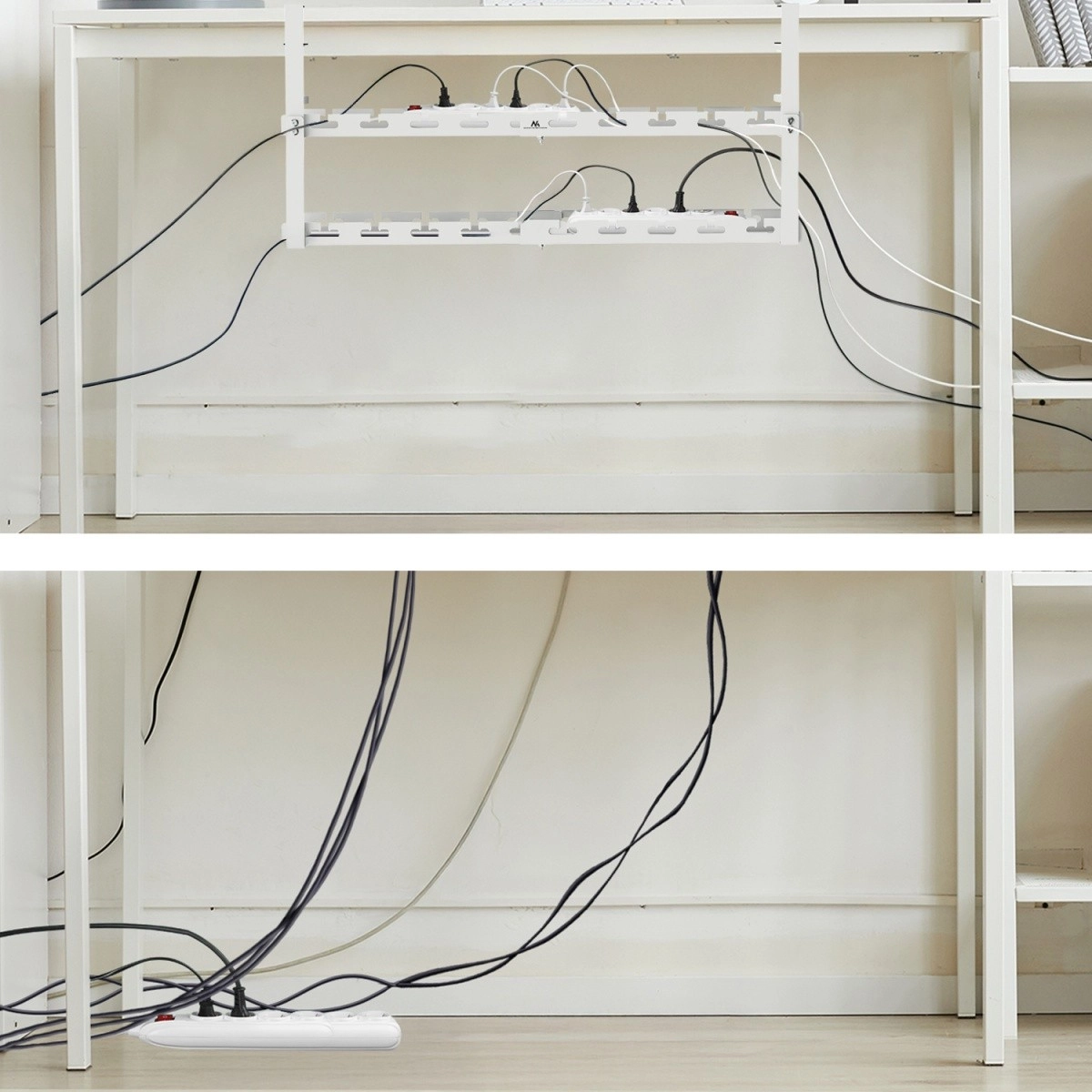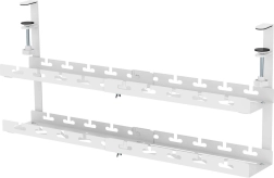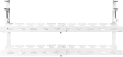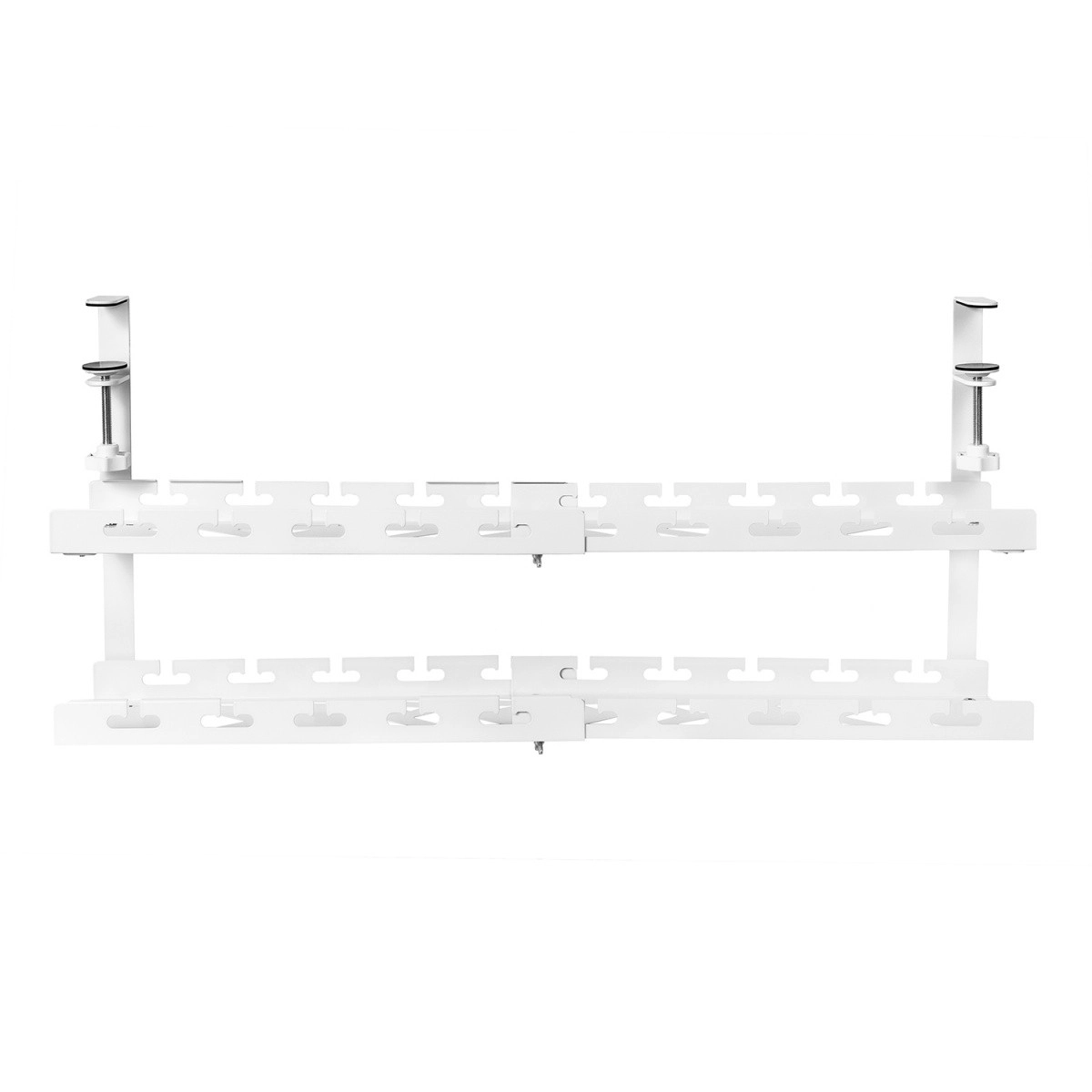 L’organisateur sous-bureau dispose de deux niveaux de supports, permettant de fixer simultanément deux multiprises ou des appareils supplémentaires tels que des adaptateurs, des hubs USB ou des routeurs. Le système de montage par serre-joints permet une installation rapide et non invasive, sans percer ni endommager la surface des meubles.