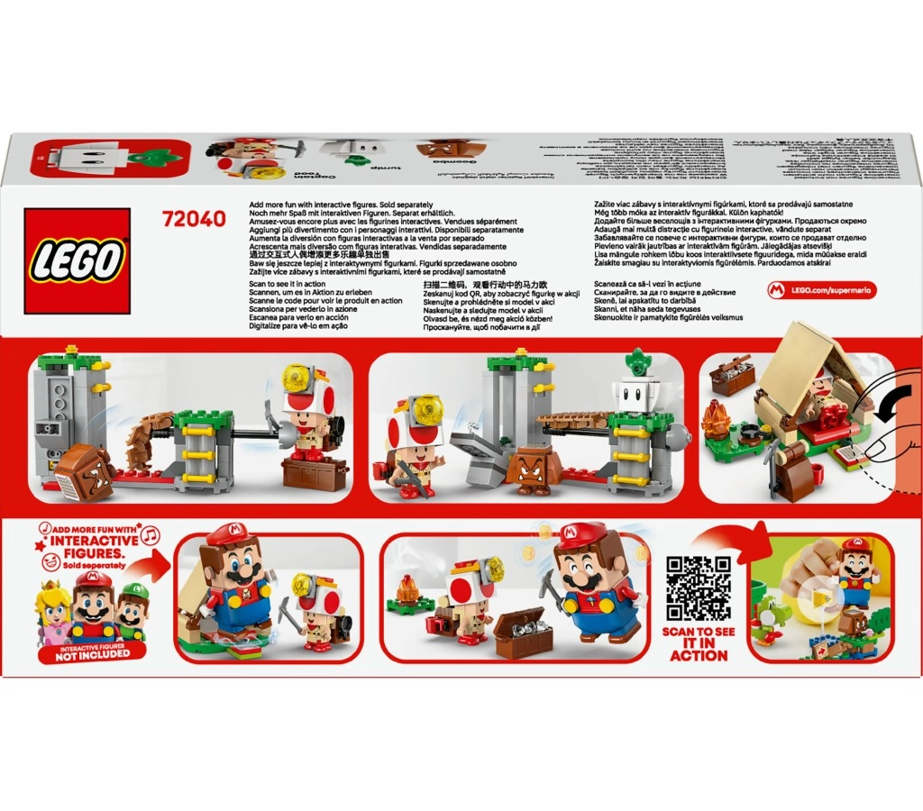 Pour encore plus de fun, ajoutez une figurine interactive LEGO Mario, LEGO Luigi ou LEGO Peach et sautez sur les tuiles d’action dans la tente et près des ennemis pour déclencher des réactions numériques et récolter des récompenses. Dans la boîte et dans l’application LEGO Super Mario, trouvez des instructions claires et de l’inspiration pour construire et transformer les niveaux.