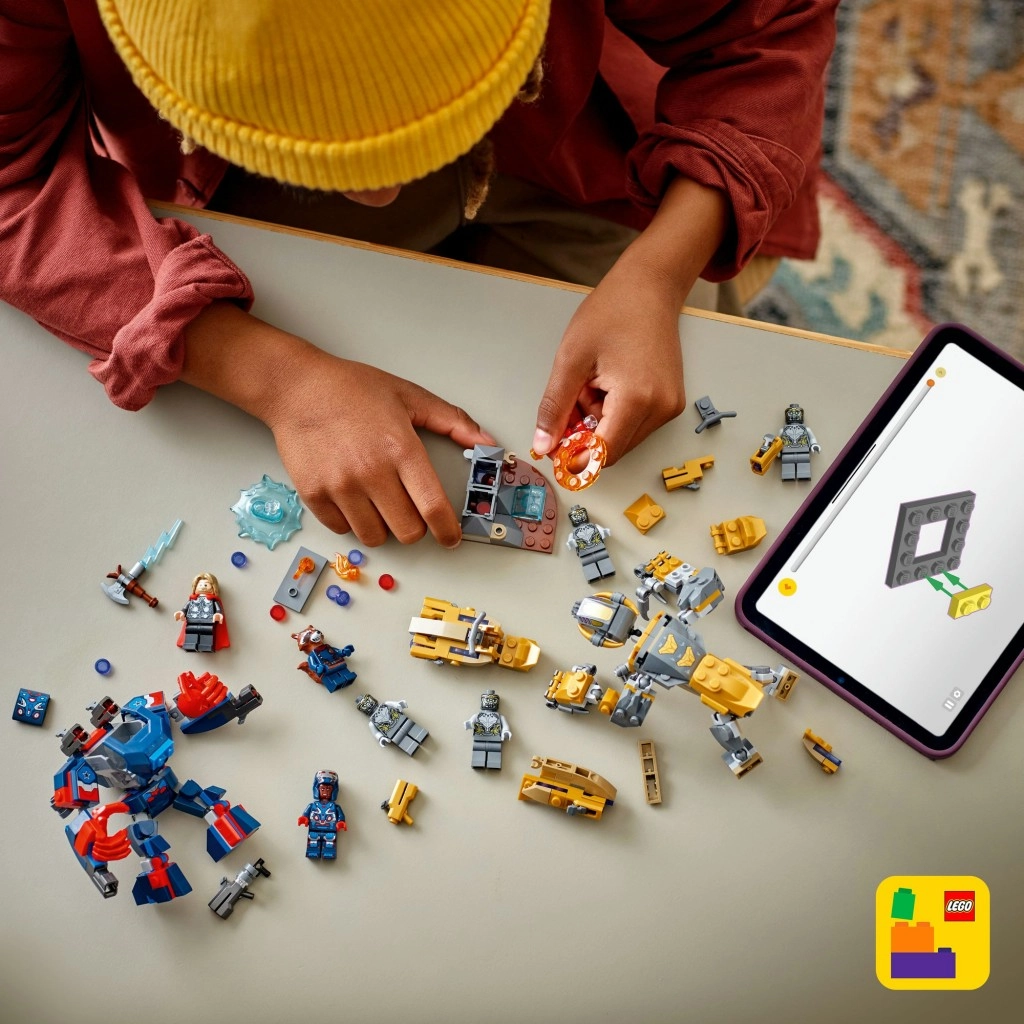 Le set comprend aussi 2 scooters à réaction, un petit décor pour Thor avec rangement pour projectiles et des accessoires pour une action sensationnelle. Avec l’application LEGO Builder, profitez d’aperçus 3D, de zoom, de rotation et du suivi de la progression de la construction – idéal pour les jeunes bâtisseurs.
