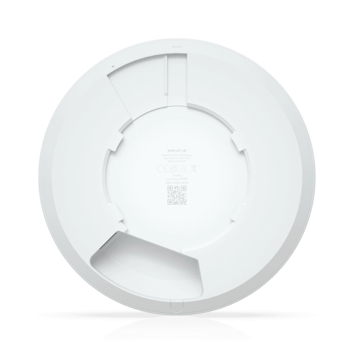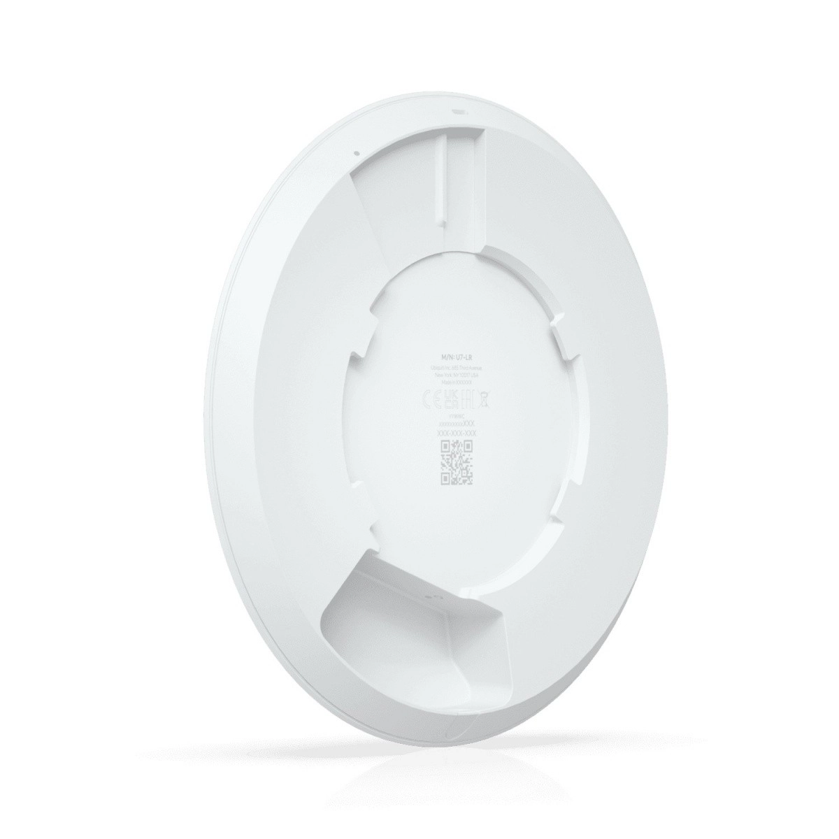 Point d’accès Wi‑Fi 7 compact avec portée de signal étendue, monté au plafond pour une meilleure couverture.