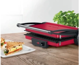 Découvrez la magie d'une cuisson saine et savoureuse avec le gril électrique Bosch TCG4104. Il permet une grillade 3-en-1 pour des possibilités illimitées de créativité culinaire. Fonctionne comme un gril de contact, un gril de table ou semi-ouvert avec chauffage supérieur et inférieur pour rôtir, gratiner ou réchauffer. Savourez des steaks juteux, des hamburgers croustillants, des brochettes dorées, des toasts, des paninis, des sandwiches ou des focaccias avec un minimum de matières grasses et un goût exceptionnel.