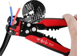 Pince à dénuder automatique 3‑en‑1 pour travailler avec des fils et des câbles de différents diamètres. Grâce au mécanisme frontal automatique, elle retire l’isolant rapidement et avec précision sans endommager les brins, permet le sertissage de connecteurs isolés et non isolés ainsi que la coupe des conducteurs. Des poignées ergonomiques antidérapantes, une réglage de la force et une butée de longueur assurent un travail confortable et reproductible à la maison comme à l’atelier.