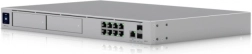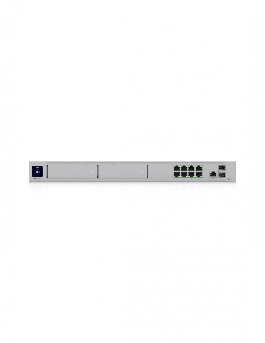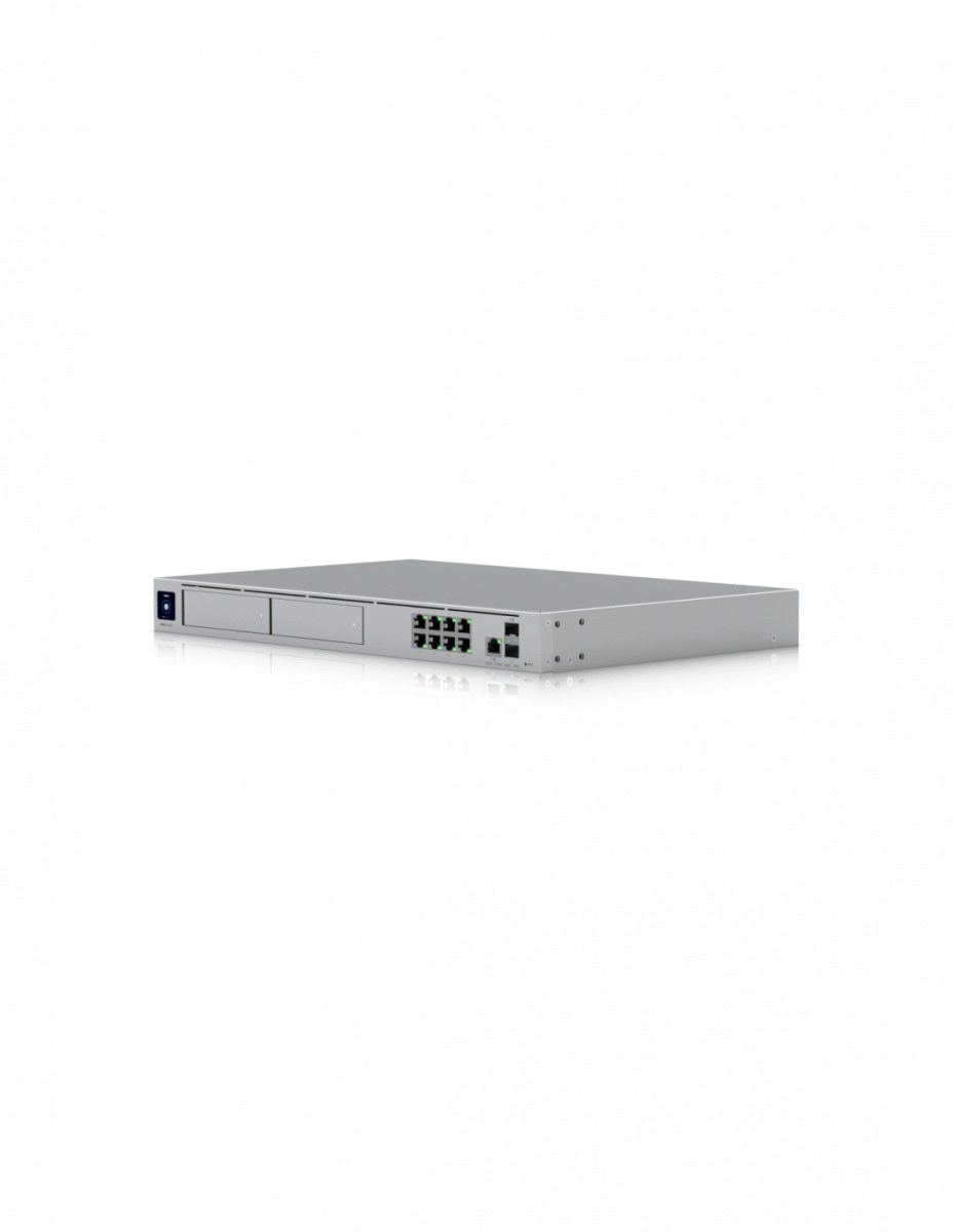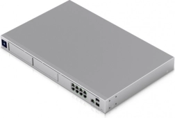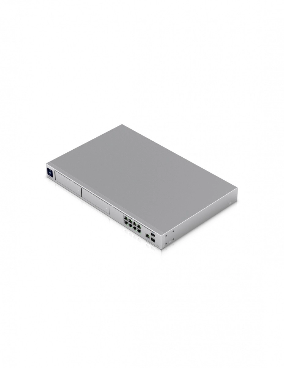 Le dispositif inclut une suite complète d’applications UniFi pour une gestion unifiée du réseau, de la sécurité et de la vidéo-surveillance. La connectivité est assurée par des ports 10G SFP+, 8× GbE LAN RJ45 et un WAN RJ45 2,5 GbE. L’écran tactile 1,3" intégré facilite le monitoring et la gestion de base directement sur l’appareil.