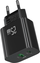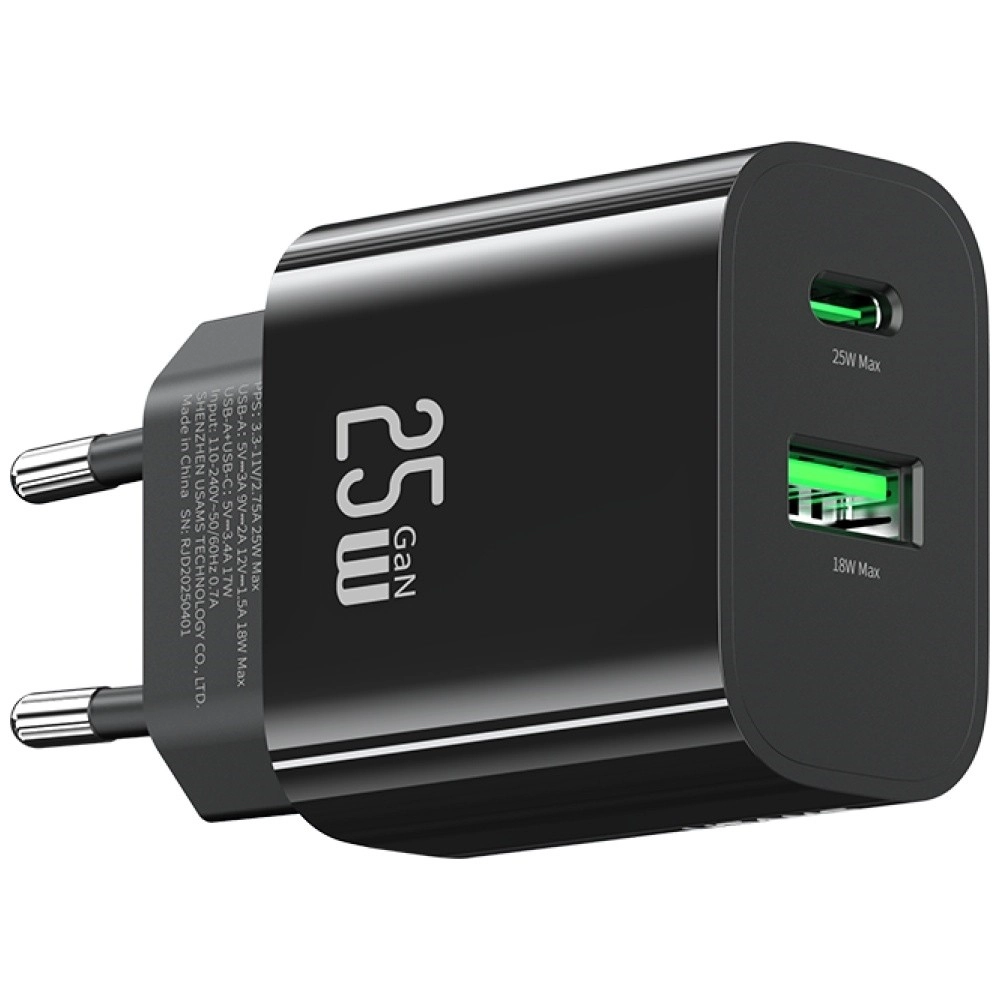 Le chargeur secteur compact de la marque USAMS offre une puissance de 25 W, des ports USB‑C + USB‑A et la technologie Fast Charging pour une recharge rapide et sûre. Grâce à sa puce intelligente, à une tension stable et à une protection contre la surcharge, il est idéal pour les smartphones, tablettes et écouteurs. Sa conception légère et robuste dans un élégant coloris noir est parfaite pour les voyages.