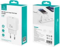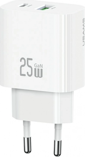 Chargeur secteur compact USAMS 25 W avec ports USB‑C et USB‑A offrant une charge rapide pour smartphones et tablettes. Grâce à la technologie Fast Charge, à une gestion efficace de la température et à une protection contre les surcharges, il assure une alimentation sûre et fiable de deux appareils simultanément. Le design blanc élégant est complété par une construction durable et des dimensions pratiques pour les déplacements.