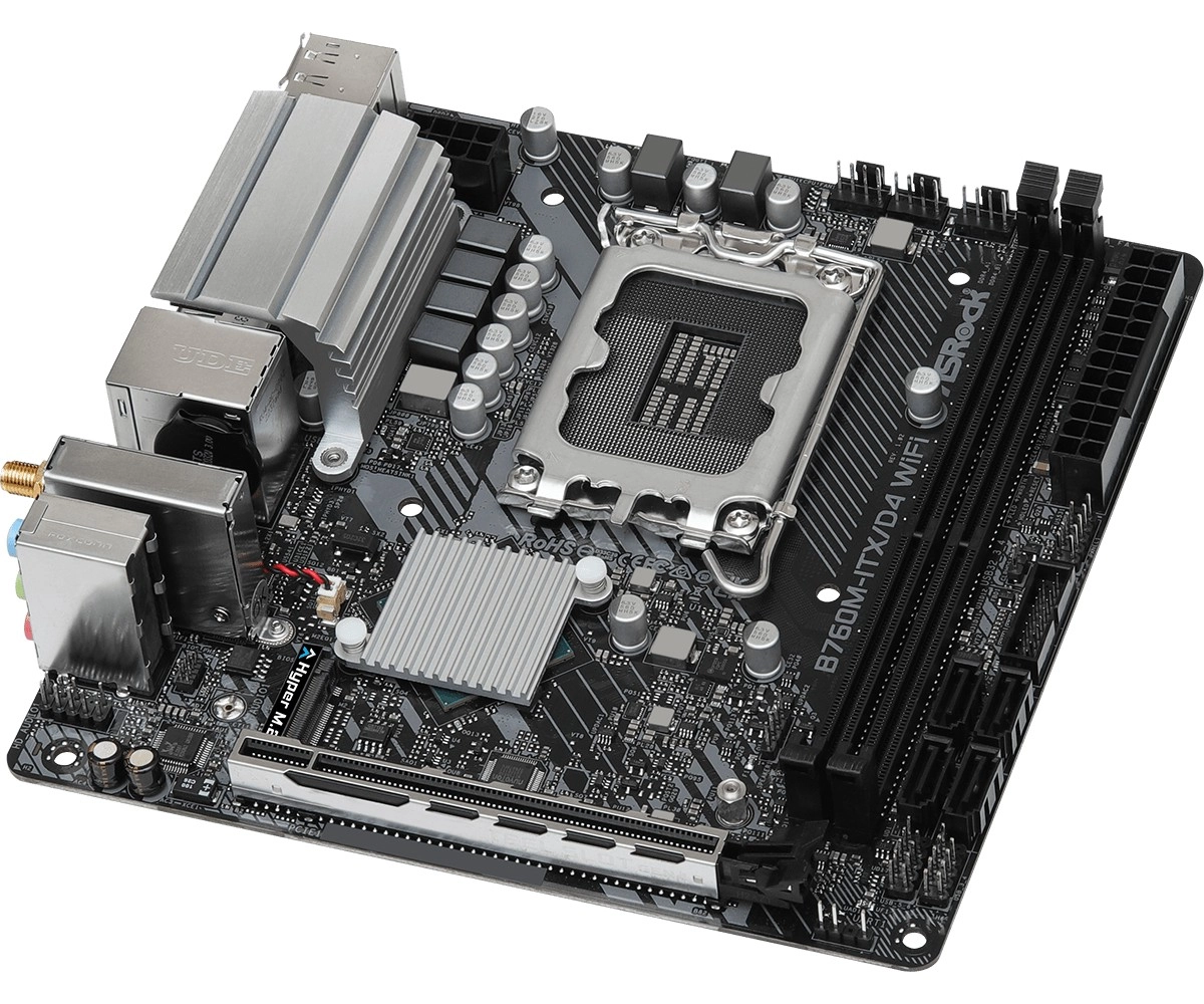 L’ASRock B760M-ITX/D4 WiFi est une carte mini‑ITX performante pour des PC compacts. Elle prend en charge les processeurs Intel Core modernes (LGA1700), la mémoire DDR4 rapide jusqu’à 5333+ (OC), les cartes graphiques via PCIe 4.0 x16 et des stockages rapides grâce au Hyper M.2 (PCIe Gen4 x4). L’alimentation stable est assurée par un VRM 5+1+1 avec Dr.MOS, un PCB renforcé à 6 couches et un slot PCIe en acier.