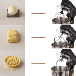 - Riche assortiment d’accessoires : crochet à pâte, fouet plat, fouet ballon, couvercle, spatule, séparateur d’œufs, poche à douille avec 24 embouts dans un organiseur.