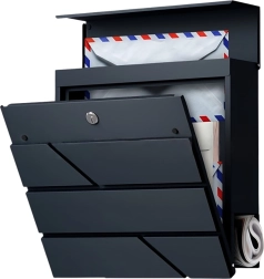 Boîte aux lettres moderne en élégante couleur anthracite, fabriquée en acier galvanisé résistant avec revêtement par poudre, offrant de l’espace pour les envois au format A4. Grâce à la large fente d’introduction et aux portes verrouillables, votre correspondance est toujours en sécurité. Résistance aux intempéries, verrouillage sécurisé et design minimaliste s’intègrent parfaitement à la façade d’une maison comme d’un bureau.