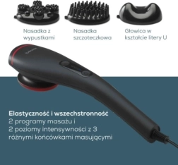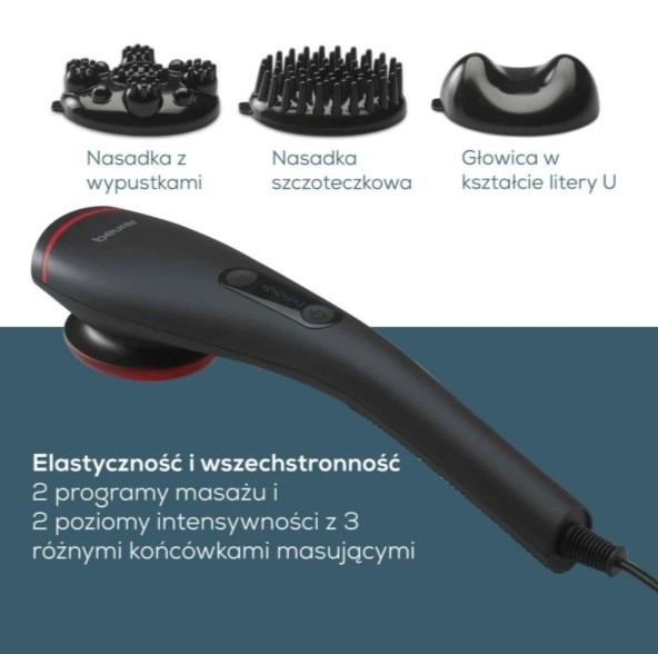 Pour adapter le massage à vos besoins, il propose 3 embouts interchangeables, 2 programmes de massage et 2 niveaux d’intensité. Une LED de couleur affiche clairement les réglages en cours, tandis que la poignée antidérapante assure une prise en main sûre pendant l’utilisation.