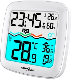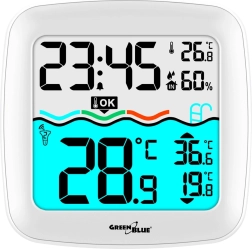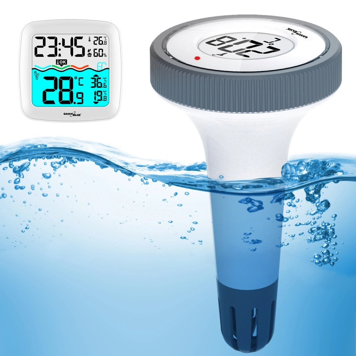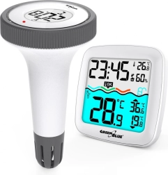Pratique station météo domestique avec thermomètre de piscine sans fil offrant une portée jusqu’à 60 m, un grand écran couleur lisible et un affichage clair de la température de l’eau, de la température et de l’humidité de l’air, de l’heure et du calendrier. Qualité fiable de la marque GREENBLUE.