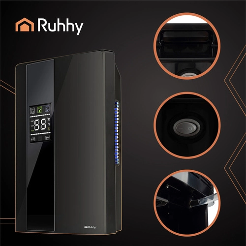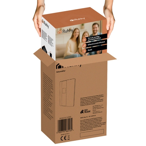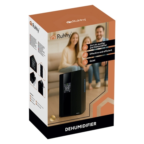 Profitez chez vous d’un air propre, sec et frais chaque jour. Le déshumidificateur et purificateur d’air RUHHY 2‑en‑1 réduit efficacement l’humidité, aide à éliminer les odeurs de renfermé et améliore la qualité de respiration. Il offre un fonctionnement silencieux de 25–30 dB, un réglage intelligent de l’humidité de 40–70 %, un panneau tactile, un minuteur 1–24 h ainsi qu’une télécommande. Grâce à la fonction UV Air Purify, il rafraîchit l’air et, avec son grand réservoir de 2000 ml, il est idéal pour la salle de bain, la cuisine, la chambre ou la cave.