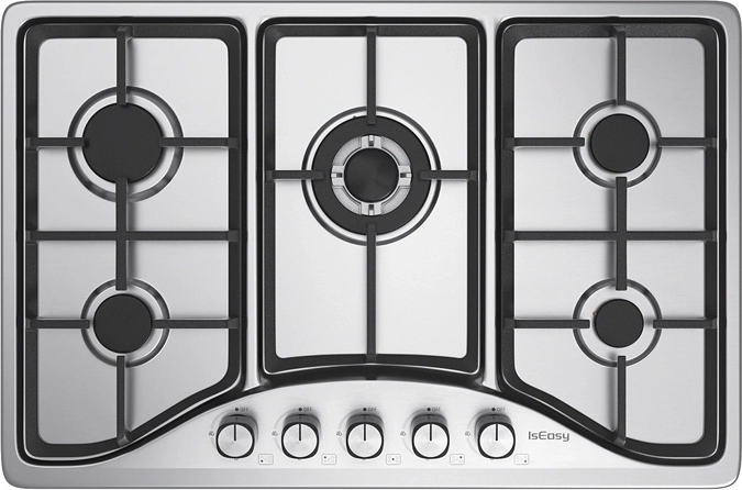 La puissante table de cuisson gaz IsEasy en acier inoxydable offre cinq brûleurs pour une cuisson rapide et précise. Grâce aux robustes grilles en fonte, à la valve de sécurité et à la compatibilité avec le gaz naturel et le GPL, elle assure des performances fiables, un fonctionnement sécurisé et un entretien facile dans toute cuisine.