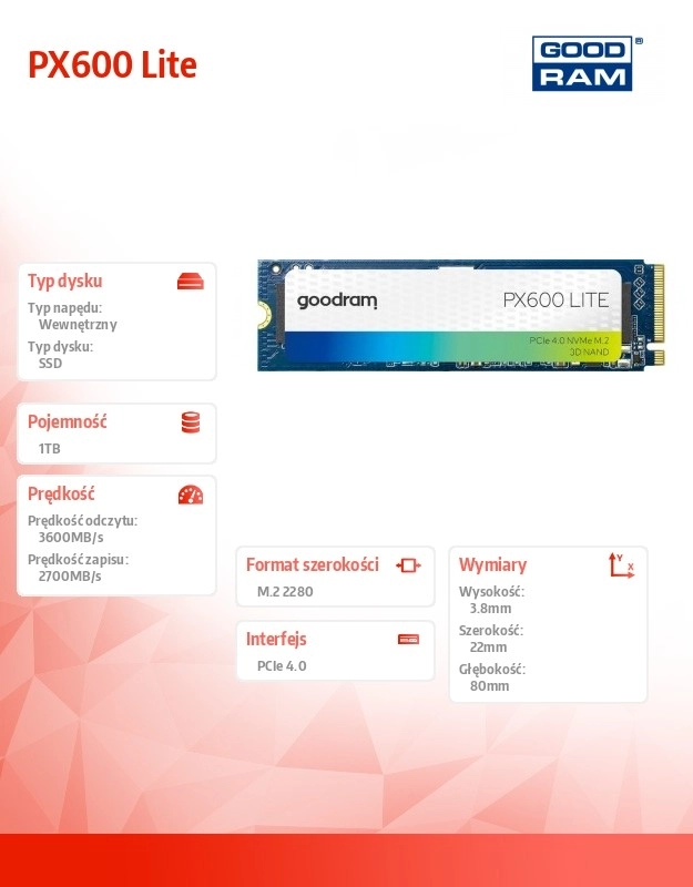 SSD PX600 Lite rapide et économe pour interface PCIe 4.0 x4 au format M.2 2280, offrant une capacité de 1 To, des vitesses séquentielles jusqu’à 3600/2700 Mo/s (lecture/écriture) et une grande résistance aux chocs et vibrations – un choix idéal pour ordinateurs portables et PC de bureau.