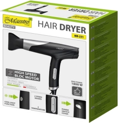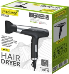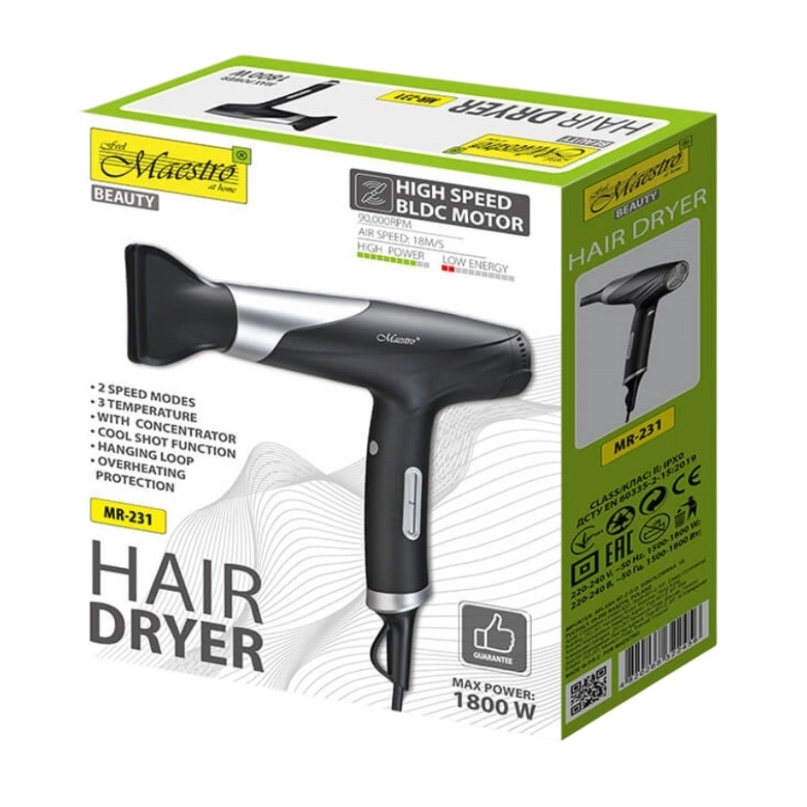 Le sèche-cheveux MAESTRO MR-231, compact et léger, offre une puissance de 1800 W, un moteur BLDC à grande vitesse de 90 000 tr/min et une vitesse d’air de 18 m/s pour un séchage rapide et délicat. Grâce à 2 vitesses, 3 températures et la fonction air froid, vous créez et fixez facilement une coiffure parfaite.