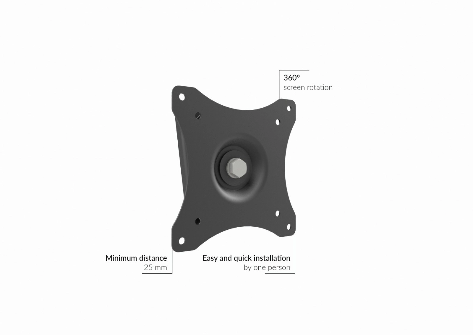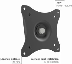 Support pratique et compact pour moniteurs et petites TV de 10–29″, idéal là où vous avez besoin d'une solution compacte avec un écart minimal par rapport au mur. La conception permet la rotation de l'écran à 360°, vous pouvez donc passer aisément du mode paysage au mode portrait. Le corps métallique au profil mince (seulement 25 mm du mur) préserve l'esthétique épurée de l'intérieur.