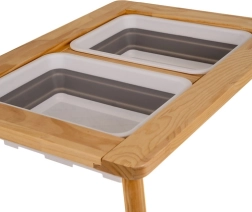 La table sensorielle KRUZZEL allie sécurité, qualité et fonctionnalité. Elle est fabriquée en bois de hêtre certifié avec une finition lisse et des angles arrondis pour jouer en toute sérénité. Le plan de travail réversible et les deux bacs en plastique amovibles transforment la table en un clin d’œil en bac à sable, table d’eau ou surface pour dessiner et créer.