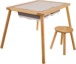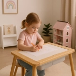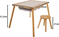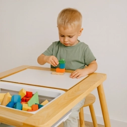 La table s’inspire de la méthode Montessori – elle favorise le développement des sens, la motricité fine et l’autonomie. Le tabouret en bois ergonomique assure une posture correcte pendant le jeu et l’apprentissage. Grâce au design scandinave et au bois naturel, elle s’intègre dans toute chambre d’enfant comme dans le salon.
