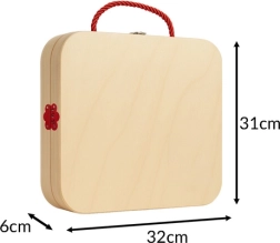 Toutes les pièces sont soigneusement polies et peintes avec des couleurs non toxiques. Grâce à la mallette en contreplaqué avec fermeture métallique et poignée en corde, tout est bien rangé et prêt à partir. Le set est un cadeau idéal pour filles et garçons et est conforme aux normes européennes.