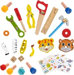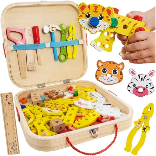Ce set complet associe jeu et apprentissage. À l’aide de la scie, du marteau, du tournevis et de la pince, les enfants vissent, assemblent et construisent des éléments colorés en joyeux animaux et moyens de transport. Il favorise la coordination, la précision et la perception de l’espace, tout en enseignant les bases de la construction.