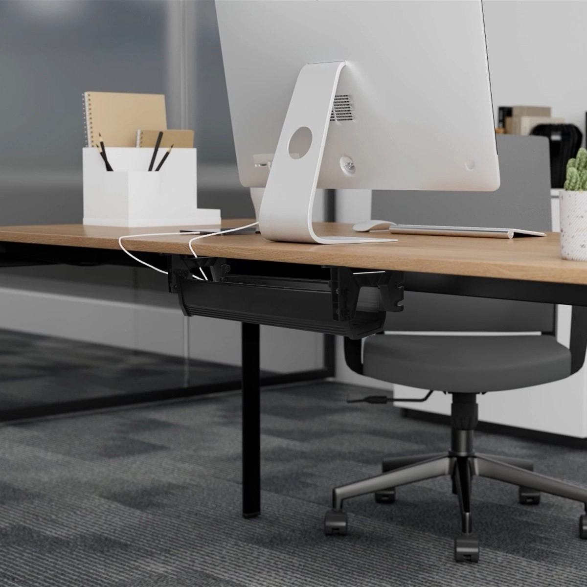 La goulotte sous le plateau maintient la multiprise et les câbles hors de vue, améliorant l’esthétique et la sécurité de votre poste de travail.