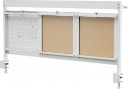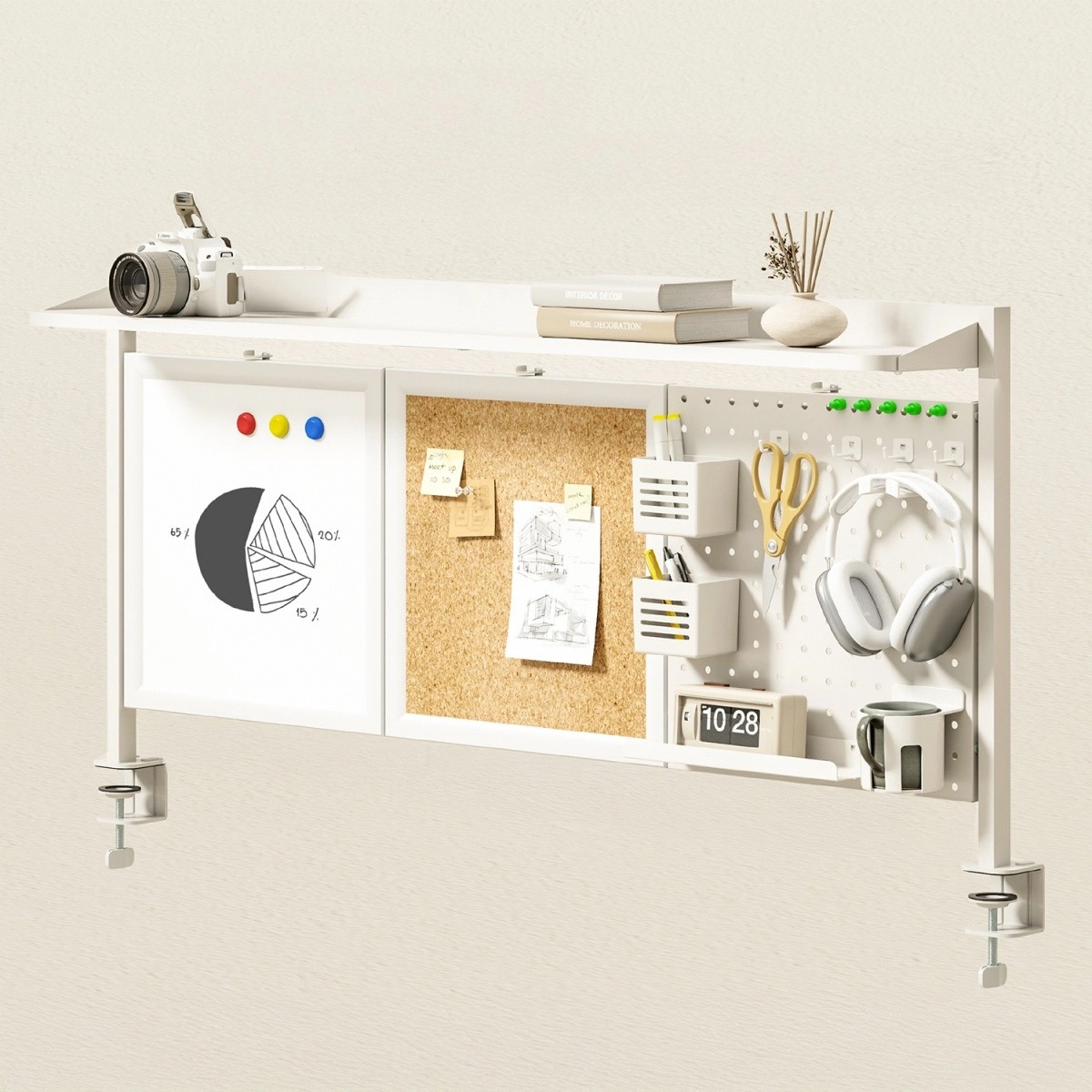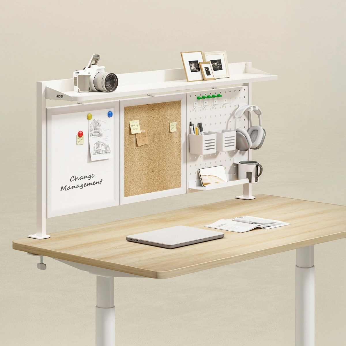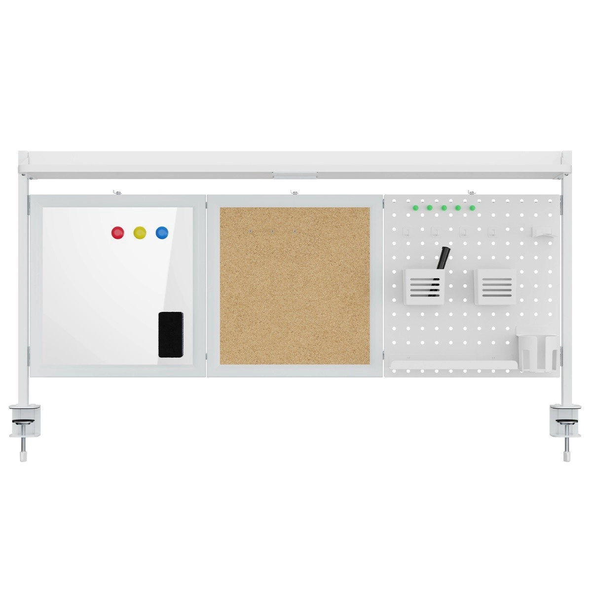 Extension de bureau compacte et extrêmement pratique, fixée à l’aide de solides serre-joints sans perçage. Combine un tableau blanc magnétique effaçable à sec, un panneau perforé type pegboard et un panneau d’affichage en liège pour une visibilité maximale. Une étagère supérieure étroite courant sur toute la largeur garde les petits objets à portée de main et l’ensemble du système aide à maintenir l’ordre sur votre plan de travail.