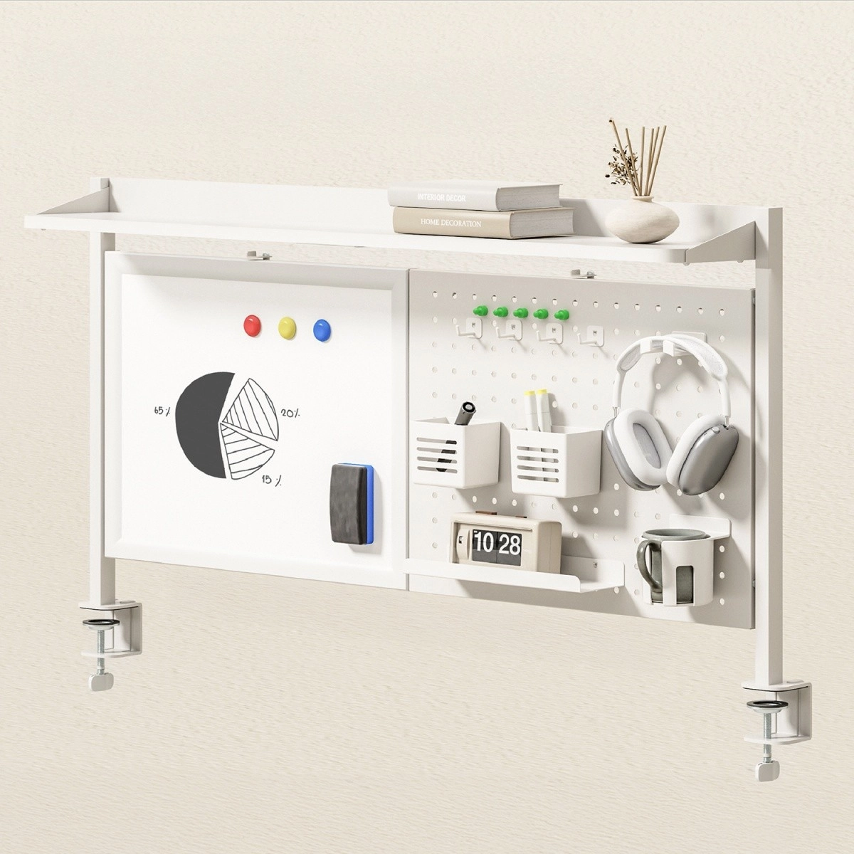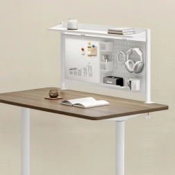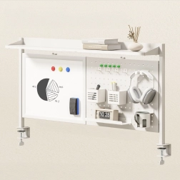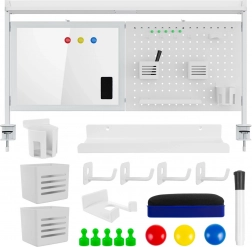 Écrivez, effacez et épinglez des notes sur le tableau blanc, tandis que le panneau perforé accueille crochets, gobelets et étagère selon vos besoins.