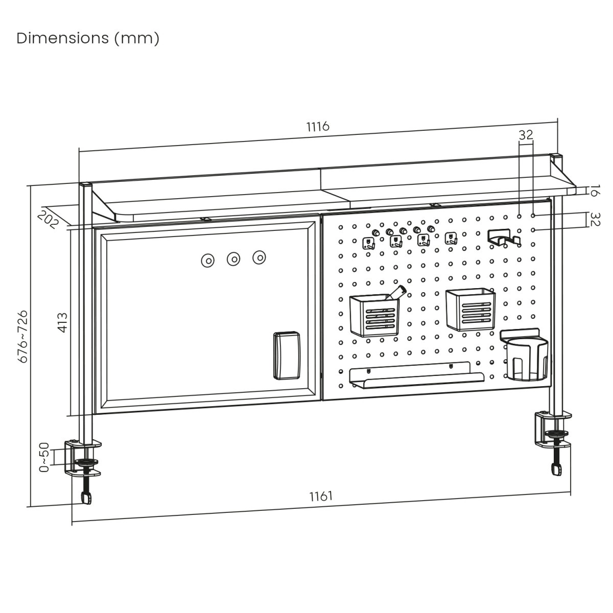 Au centre se trouve un tableau blanc magnétique effaçable à sec pour écrire et placer des aimants, et à côté un panneau perforé métallique (pegboard) pour suspendre les accessoires avec flexibilité. L’emballage comprend tout le nécessaire pour une utilisation immédiate : crochets, gobelets porte-stylos, porte-mug, étagère, ainsi qu’un ensemble d’aimants et de punaises magnétiques.