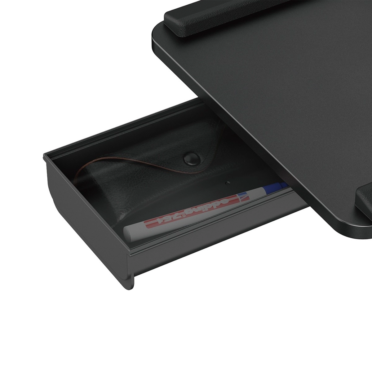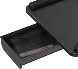 Un tiroir latéral intégré accueille les petits accessoires, tandis que les rebords relevés tout autour empêchent la chute du clavier ou de la souris.