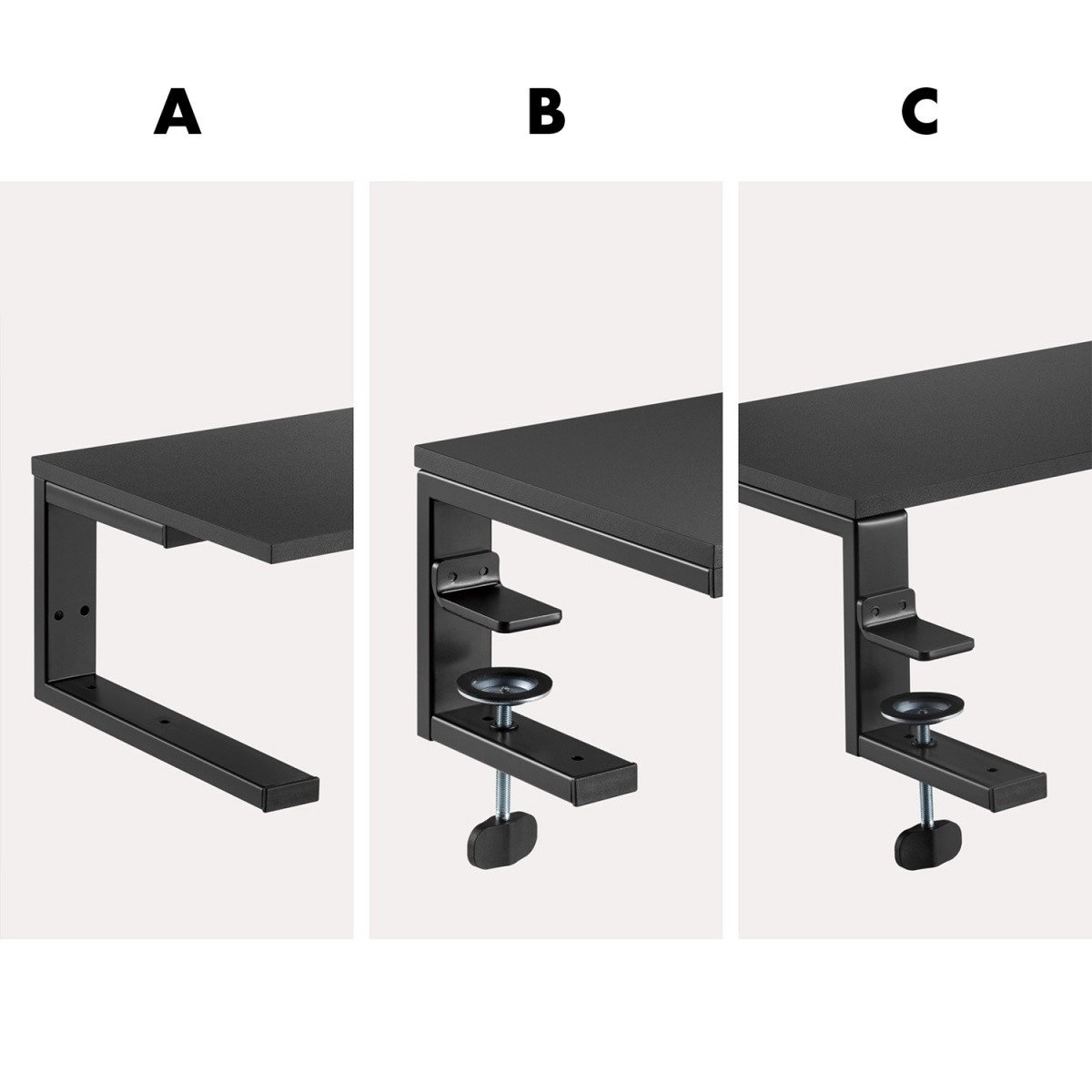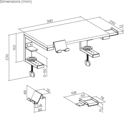 L’installation est rapide et sans endommager le mobilier – deux serre-joints réglables se fixent fermement au plateau (épaisseur max. env. 50 mm), tandis que les patins en caoutchouc protègent la surface contre les rayures. La construction robuste garantit une grande stabilité même pour des appareils plus lourds jusqu’à 20 kg.