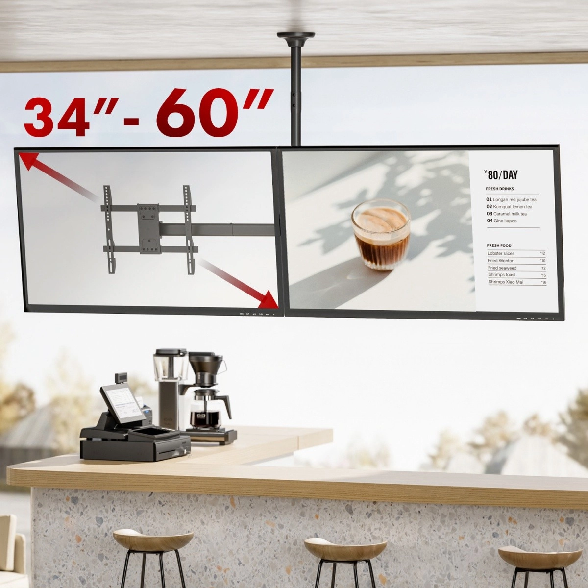 Le support de plafond professionnel pour deux TV est idéal pour les bureaux, magasins, réceptions, salles de sport et domiciles, où l’on a besoin d’un gain de place et d’une visibilité parfaite. La construction robuste en acier assure la stabilité, tandis que le réglage précis de la position permet un visionnage confortable sous n’importe quel angle.