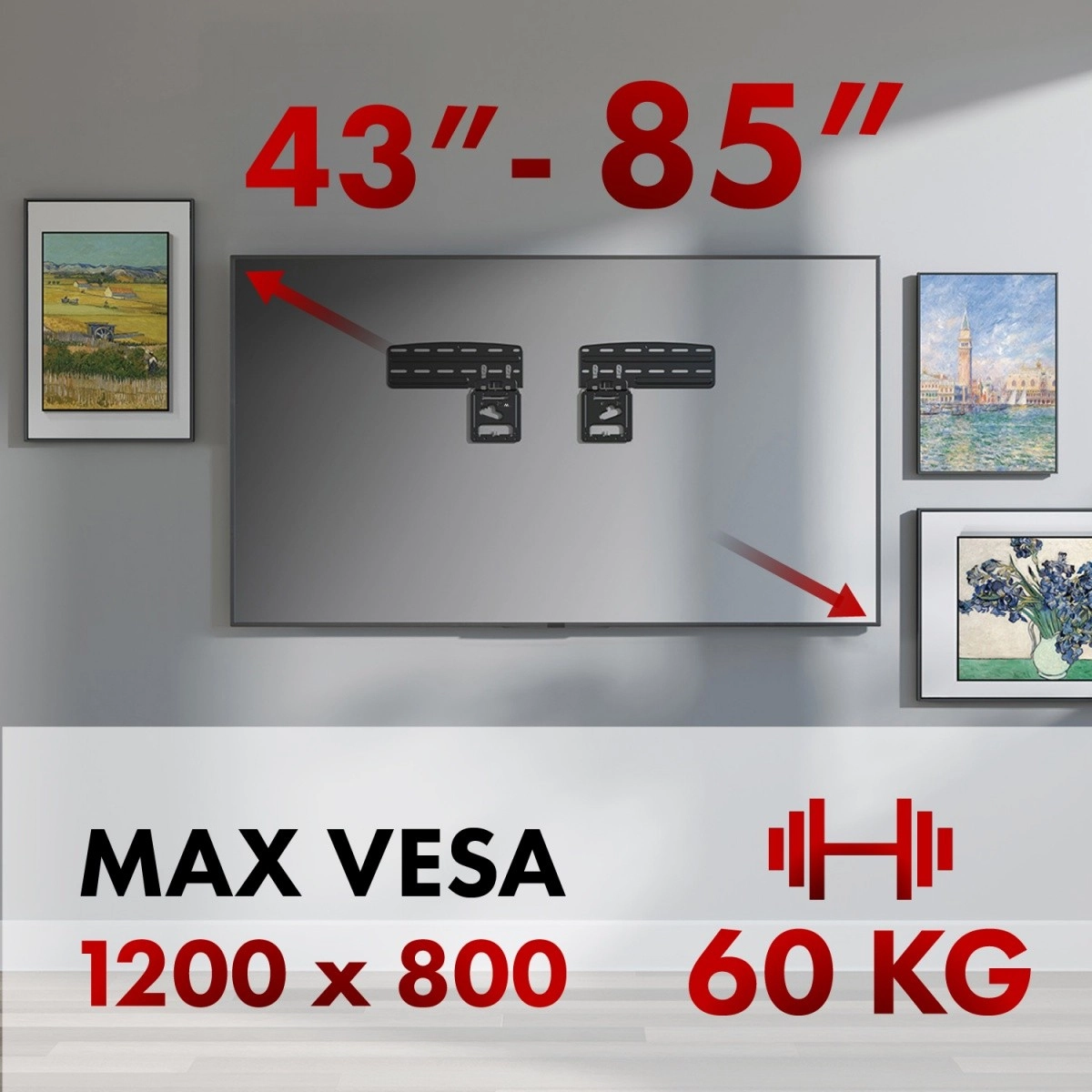 La structure métallique robuste avec une capacité de 60 kg assure une stabilité durable, même pour les grandes diagonales 43–85". Le système de montage bien pensé, avec gabarits précis et kit de visserie, facilite l’installation et permet une fixation sûre sur différents types de murs.