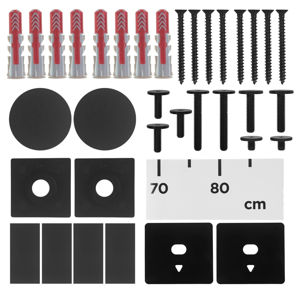 La boîte comprend des vis, chevilles, rondelles et un gabarit d’installation pour un montage mural rapide et précis.