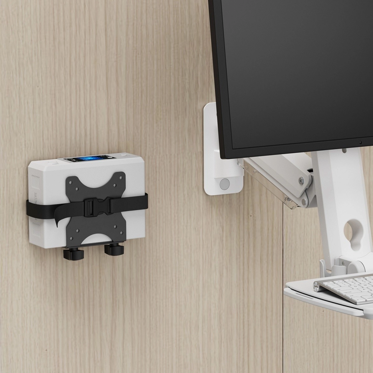- Gain de place et gestion propre des câbles : montage derrière le moniteur ou au mur