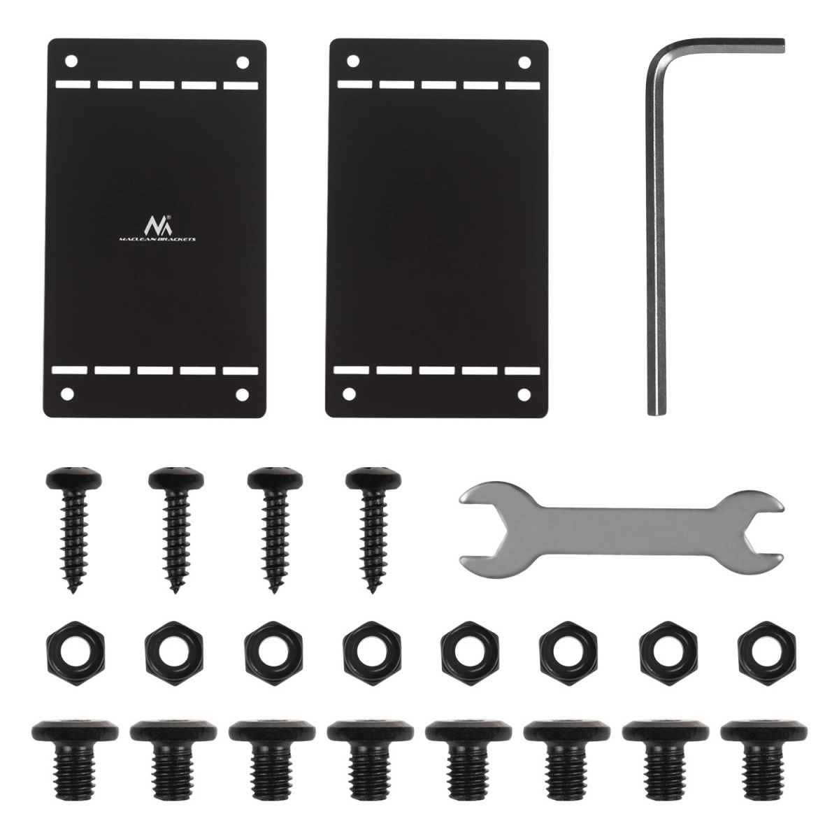 La boîte contient vis, écrous, clé et clé Allen – vous installez rapidement sans achats supplémentaires.