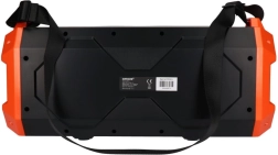 Un panneau latéral pratique avec un écran lisible assure une utilisation aisée. La batterie intégrée de 2000 mAh offre jusqu’à 5 heures d’écoute et se recharge complètement en environ 3 heures. Une bandoulière est incluse pour un transport confortable. La finition noire robuste avec accents orange est à la fois stylée et moderne.