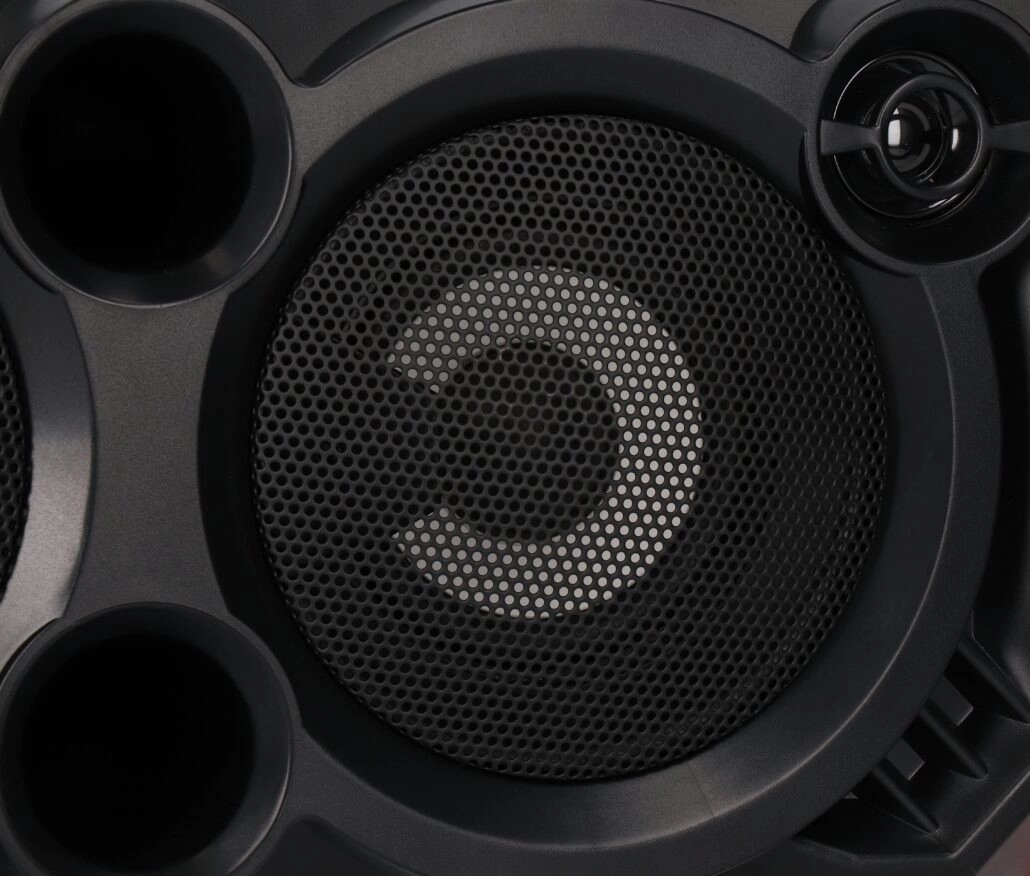 Grâce à la conception Bass reflex et à une puissance musicale jusqu’à 100 W (3 200 W P.M.P.O.), le son est fort, riche et avec un accent sur les basses. L’égaliseur permet d’ajuster aigus et basses pour affiner le rendu. La fonction karaoké avec entrée micro 6,5 mm et réglage séparé de l’effet écho mettra l’ambiance à chaque fête, rehaussée par un éclairage LED multicolore.