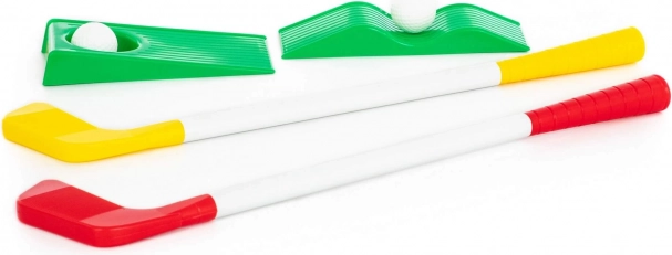 Le set pour enfants comprend des clubs en plastique avec têtes rouge et jaune, légers et faciles à manier.