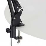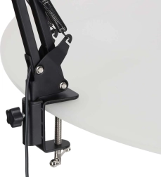 La boîte contient à la fois une base ronde stable et une pince de fixation pour le bord du plateau (max. 5 cm). Choisissez la solution qui convient à votre espace de travail – posée sur le bureau ou en économisant de la place grâce à la pince.