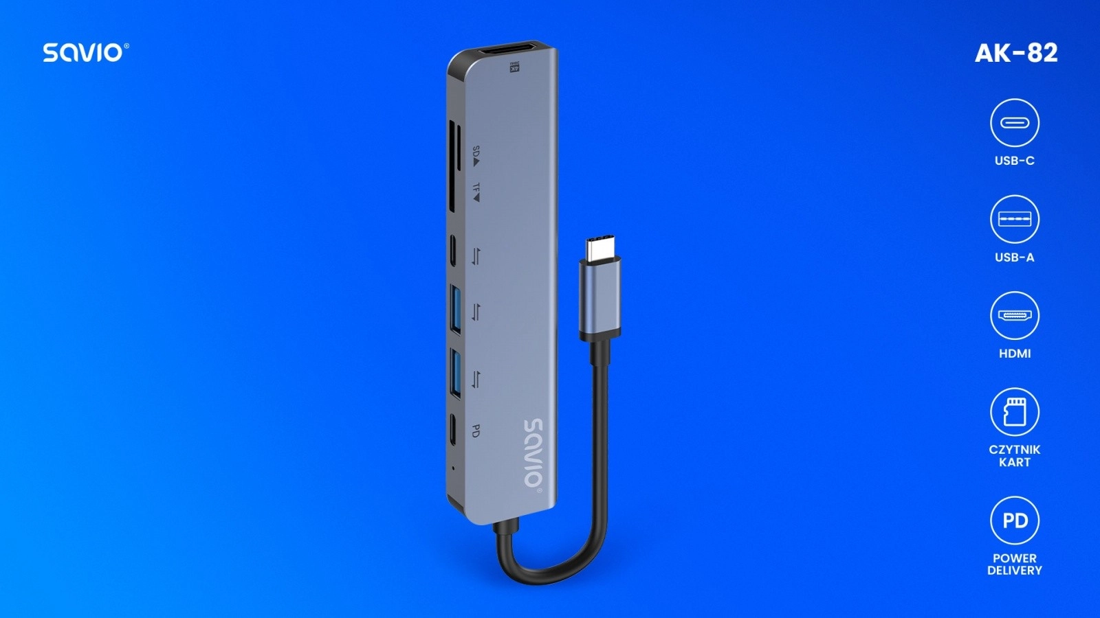 Le Savio AK‑182 étend votre appareil avec sept interfaces pratiques sans besoin d’adaptateurs supplémentaires. Via HDMI, connectez facilement un moniteur, un projecteur ou une TV avec prise en charge du 4K à 30 Hz pour une image nette sans latence. Deux ports USB‑A assurent la compatibilité avec les accessoires – l’un pour un transfert de données rapide, l’autre pour une souris, un clavier ou une imprimante.
