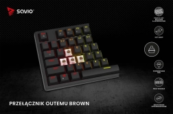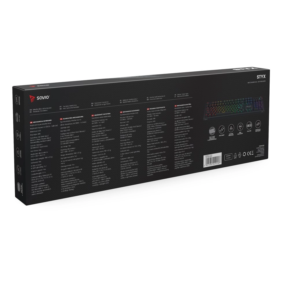 Savio Styx combine une construction durable, des performances fiables et des fonctionnalités modernes dans un format pleine taille avec pavé numérique. Les interrupteurs tactiles OUTEMU BROWN offrent une résistance équilibrée, un léger point tactile et une frappe plus silencieuse – idéal pour le jeu et la saisie prolongée. Grâce aux sockets hot-swap, vous adaptez facilement le clavier à vos préférences sans soudure.