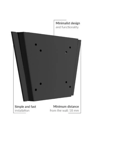 Support mural plat et compact pour petits écrans 10–29". Grâce à sa conception minimaliste, l’installation est rapide et facile, tandis que la distance au mur de seulement 18 mm assure une fixation élégante et discrète. Sa qualité de fabrication séduira même les utilisateurs exigeants et convient aux chambres d’hôtel comme aux petites salles d’attente.